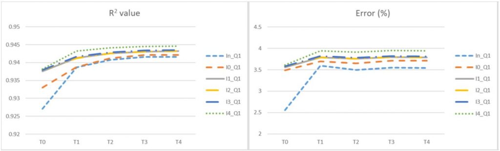 Métricas de error del modelo ante distinto número de coeficientes de Temperatura (TX) y de Irradiancia Solar (IX) considerados.