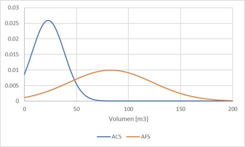 En principio, se podría plantear que el consumo mensual en ambos casos sería similar a una distribución normal. Y que un consumidor concreto estaría siempre en el mismo percentil de consumo. Es decir. Si consumes mucha agua fría, consumes también mucha agua caliente. Midiendo individualmente el agua fría, y conociendo el consumo global de agua fría y caliente, se podría saber el consumo de agua caliente de cada consumidor. Las distribuciones normales de los consumos de ACS y AFS son las siguientes.