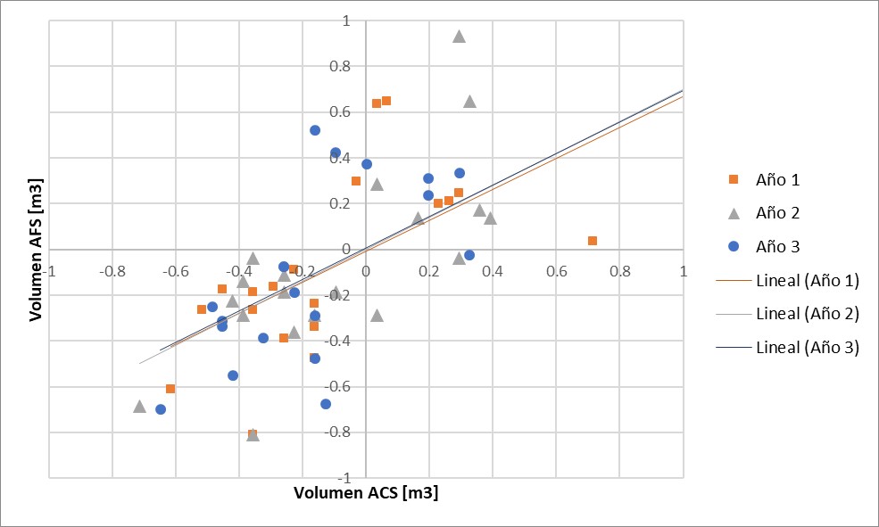 Sin embargo, un estudio más en detalle muestra que no existe un rato fijo entre el consumo de agua caliente y agua fría. En la siguiente imagen se puede ver cómo cada punto de facturación (1 año de ACS y AFS) se desvía significativamente de una relación lineal entre ambos consumos. Sí es cierto que existe una relación aproximadamente constante entre el ACS y el AFS para todos los consumidores, que se mantiene relativamente constante para todos los años.