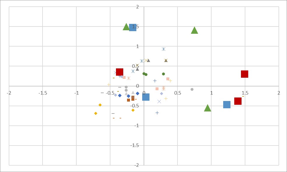 Incluso, tomando el consumo anual para consumidores concretos se ve cómo existen relaciones variadas. En la figura de abajo se identifican consumidores con una variación relativamente pequeña de AFS y gran variación de ACS (rojo), con relaciones lineales inversas (Azul y Verde), con gran variación alterna de uno de los consumos (Azul) o de los dos consumos simultáneamente (verde)