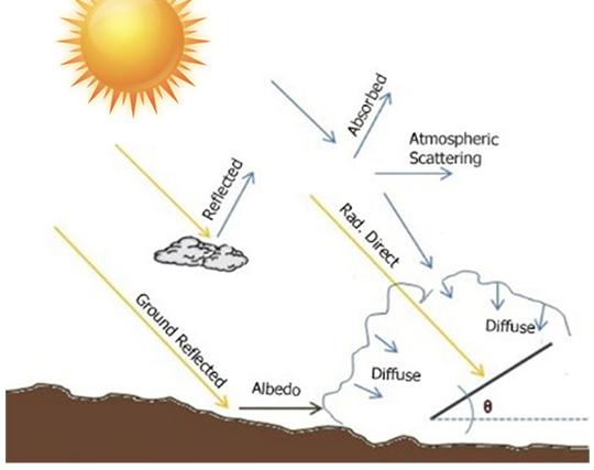 - Solar radiation comes from the sun. Until it gets into the atmosphere, all the radiation goes in the same direction. But then it is absorbed, reflected, re-emitted, etc. In the atmosphere, geographical obstacles, the ground, etc. In the end, the solar radiation impacting a building is a mixture of Direct (coming directly from the sun) and Diffuse radiation. Ground Reflected is also a different kind of radiation, but for the purpose of this blog post, I will integrate this into the Diffuse term.