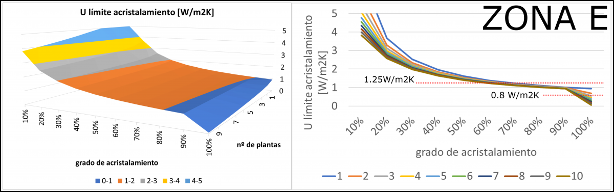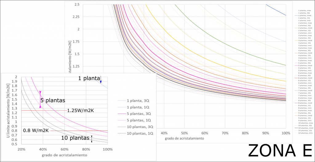 - Como la media no suele ser una buena medida de la realidad, tomando un grupo más amplio de valores (valores entre el 25 y el 75% de los casos, a igual número de plantas y grado de acristalamiento), se tiene una visión más general. Los edificios de hasta un 50% de acristalamiento pueden resolverse con sistemas de mercado y/o “premium”. Los edificios de más de 5 plantas necesitan de soluciones “premium” a partir de un 40% de acristalamiento. Los edificios de 10 plantas o más tendrían problemas para garantizar el nivel de Klim con las soluciones actuales para grados de acristalamiento del orden del 50%. Debe considerarse que esto es así para la zona climática E, la que presenta mayores restricciones.