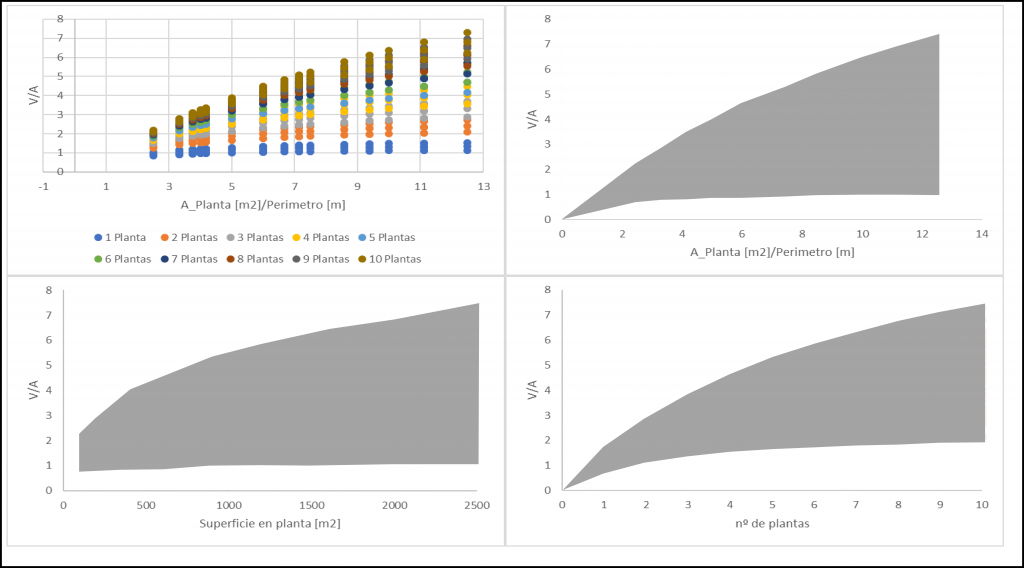 - El valor de compacidad varía sustancialmente. Los edificios de 1 planta se encuentran en el rango entre >1 y 2. Mientras que los edificios de 10 plantas (o más) no bajan de 2. Entre medias, se alcanzan valores de V/A superiores a 4 para edificios de 4 plantas o más. Los edificios de planta cuadrada y gran superficie tienen valores mayores que los de plantas rectangulares y superficies pequeñas.