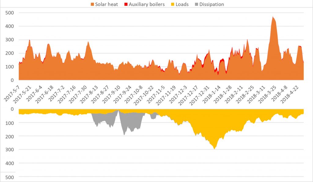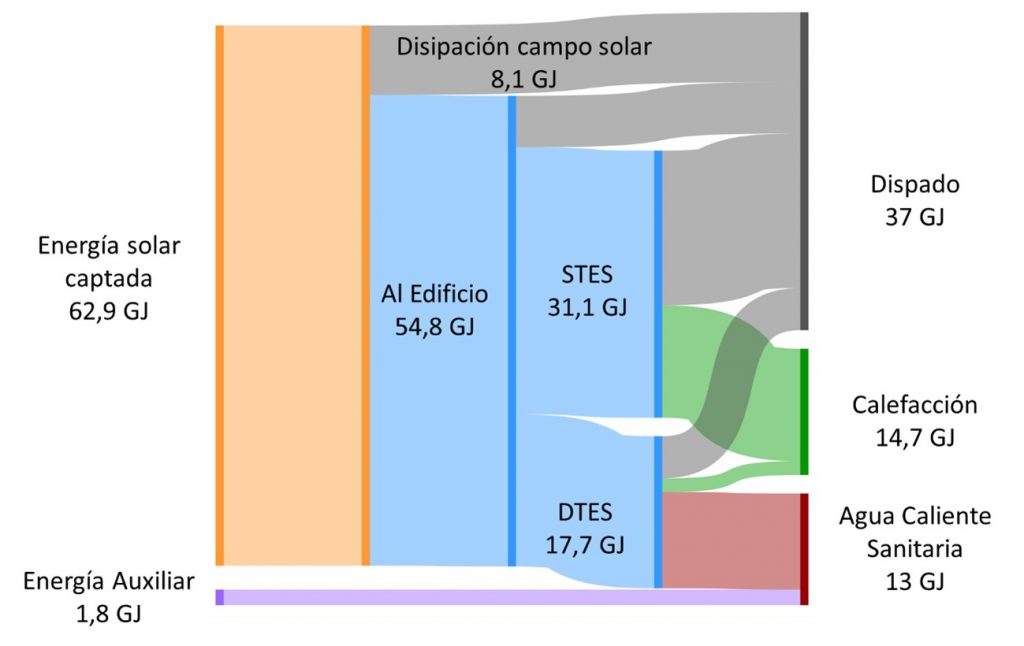 De hecho, el tema de las pérdidas merece un estudio en detalle. Del total de la energía solar captada, el 7% se pierde antes de llegar a ser almacenado. La eficiencia de almacenamiento es del 42%, y durante la fase de utilización, el 11% se pierde por distribución. En el fondo se debe a que es un sistema complejo, con grandes sistemas de almacenamiento y longitudes de tubo no desdeñables. Todo esto hace que sea necesario analizar detalladamente las pérdidas de distribución y almacenamiento térmico.