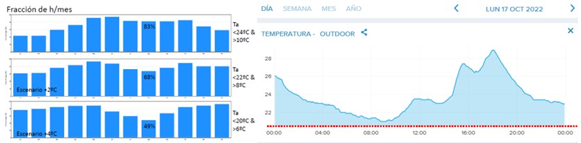 El curso también buscaba introducir el concepto de adaptación (al cambio climático), y planteé algún caso de estudio basándome en la climatología de Bilbao. Para ello empleé la herramienta clima (nuevamente de Berkley). En una primera aproximación, el impacto del calentamiento climático en el consumo de energía se puede estudiar modificando la temperatura de referencia para el cálculo de los grados día de refrigeración. Igualmente, también para permitir la ventilación natural.