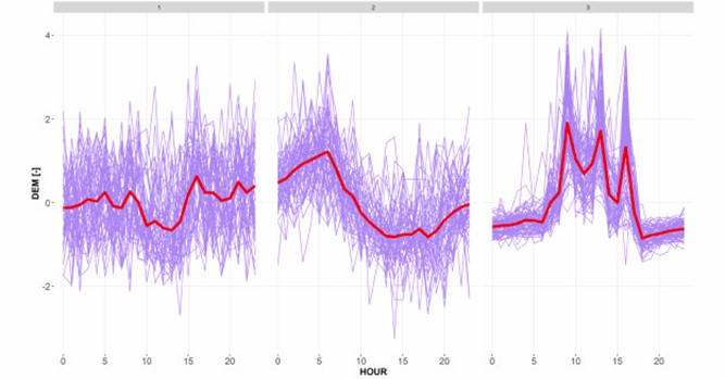 Basically, the hourly heat load in each day is encoded in a vector of 24 values, which is later-on normalized (with various approaches). Unsupervised Machine Learning processes are used to define groups (clusters) of days with similar patterns (i.e. heat load rises in the morning & stays high until 5pm…and so on). Given that the load is normalized, I would say that most of these variations are due to user behaviour, with minimal impact of climate.