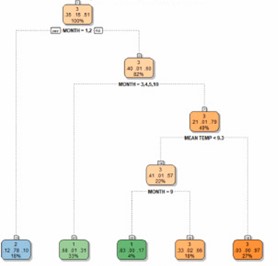 Now that the patterns are identified, the second issue arises. How can we predict which will be the relevant pattern for the day ahead? To do so, we need to assign the relevant pattern based only on exogenous data. We do so by developing a decision tree based on calendar data (month, day of the week,…business holidays) and climate data (forecasted mean temperature for the day ahead).