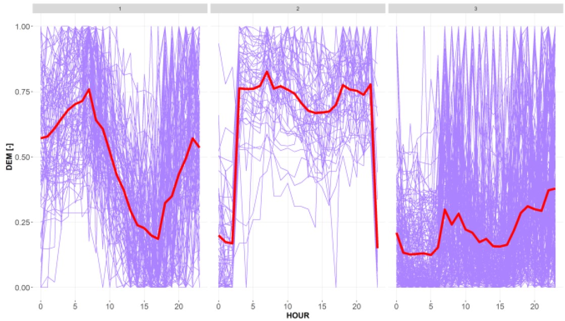 Uno de los primeros puntos importantes es definir lo que es un perfil de demanda. Para nosotros es un conjunto de datos que representan perfiles (horarios) de 24h de duración. Los perfiles se normalizan 0-1 en base al valor máximo.