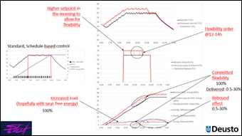 • Peak shaving/load shifting is deterministic. With the load profile agreed on the preceding before. Our models support our decision making, given known/forecasted energy cost, and weather conditions (hopefully also, very precise occupancy profiles, etc.).